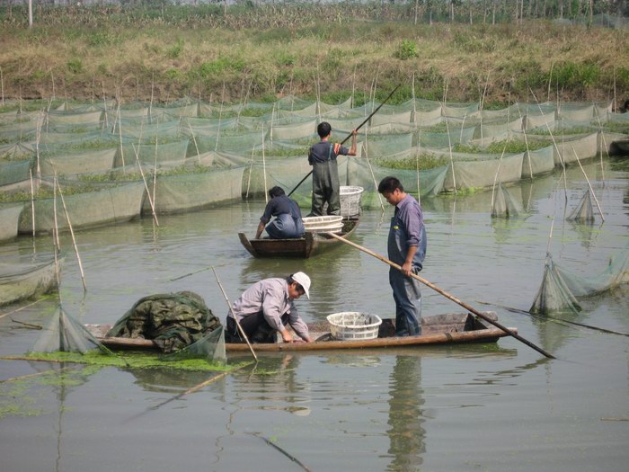 秋日的阳光映照在一格格绿色网箱上,网箱内的绿草被依次扒开,身着皮衣、皮靴的五六个捕捞者分成三组,划着三只小船从箱内格子里捞取黄鳝,一篓一篓地运到岸上。