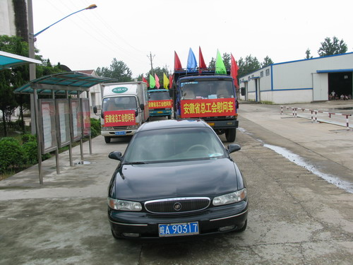 7月25日上午十时,五辆悬挂着“安徽省总工会慰问车”条幅的大型货车满载着救灾面粉缓缓驶出雁湖面粉公司厂区,奔赴本省的临泉县灾区。这是由省总工会组织社会各界向灾区捐赠的首批救灾物资。安徽雁湖面粉公司是省总工会指定的救灾面粉唯一供应商。