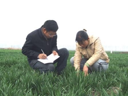 图为龙亢农场农科所科技人员定期检查记录小麦育种生长情况。