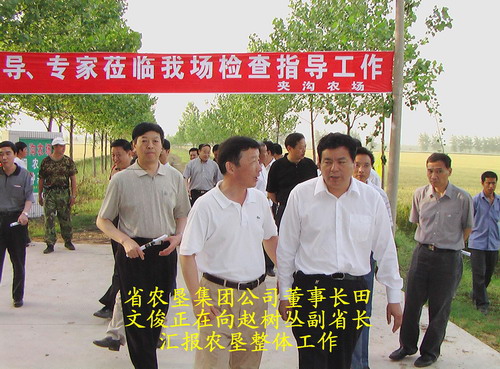 2008年5月28日下午,安徽省委常委、副省长赵树丛在省农委、宿州市委市政府、省农垦集团公司等领导的陪同下,到安徽农垦夹沟农场检查小麦高产攻关活动的开展情况。赵副省长一行首先听取了该场负责人关于近年来开展小麦高产攻关活动的具体落实情况汇报。在听完汇报后,赵副省长对该场在农业生产中采取的“五统一”管理模式,在高产攻关活动中率先在全省取得小麦单产600公斤大关等成绩给予了高度赞扬,同时还提出了许多栽培管理方面的技术问题。特别是当他得知并目睹该场小麦单产在超过600公斤而不出现倒伏现象时,兴致盎然地询问了一些栽培方面的具体措施,并随即告诉随行人员,要积极向全省广大农民朋友宣传推广夹沟农场小麦高产栽培技术,使他们在生产中学懂会用进而产生效益,加快致富奔小康步伐。最后,赵副省长勉励省农垦及夹沟农场要及时总结小麦高产攻关经验,积极探索小麦高产栽培规律,推广普及小麦高产栽培技术措施,充分发挥农场在社会主义新农村建设中的示范带动作用,为我省农业的发展做出应有的贡献。