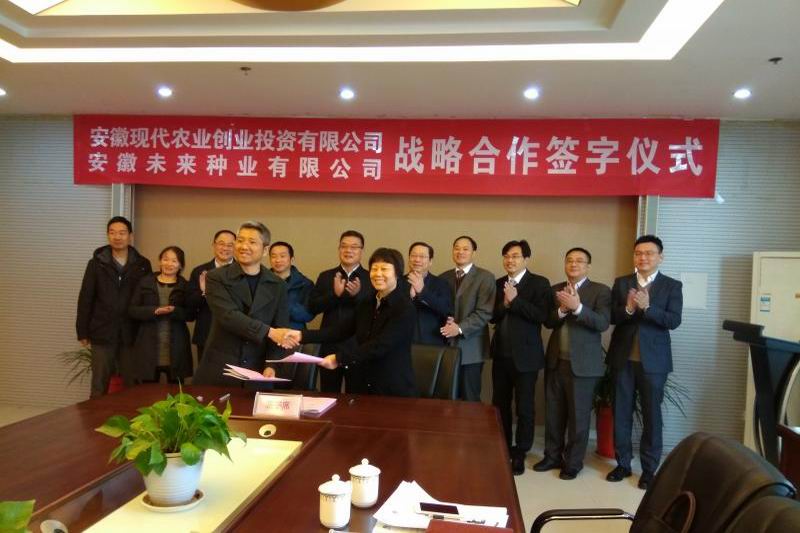 1130,安徽现代农业创投有限公司与安徽未来种业有限公司举行战略合作签约仪式,农垦集团总会计师、创投公司董事长高有荣和未来种业执行董事王锦签署了增资及回购合作协议。省种子管理总站站长熊成国及合作双方中层以上管理团队到场见证。