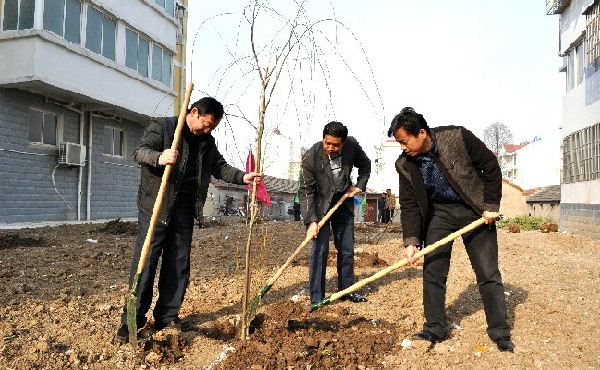 311,在安徽农垦潘村湖农场蟠龙花园小区,场长柏华胜等场领导正在和干部职工一道参加社区组织的义务植树活动。