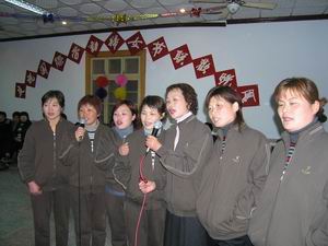 由潘村湖农场商业公司、机关、供销公司等单位女 工委主办的庆祝“三八国际劳动妇女节”联欢晚会 于3月8日晚在场部大会议室举行。图为女职工在表 演小合唱的情景。(杨登宏摄)