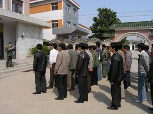 明光市人武部日前发布命令,要求潘村湖农场基干民 兵连于4月15日下午3点到农场场部快速集结待命.接 到命令后,场武装部迅速将命令下达到各排、班。当 天下午3点,来自场属各单位的67名基干民兵指战员 奉命集结到位,到位率达96%%,受到前来点验的明光 市人武部领导的称赞。图为农场民兵连正在接受点 验的情景。(杨登宏摄)